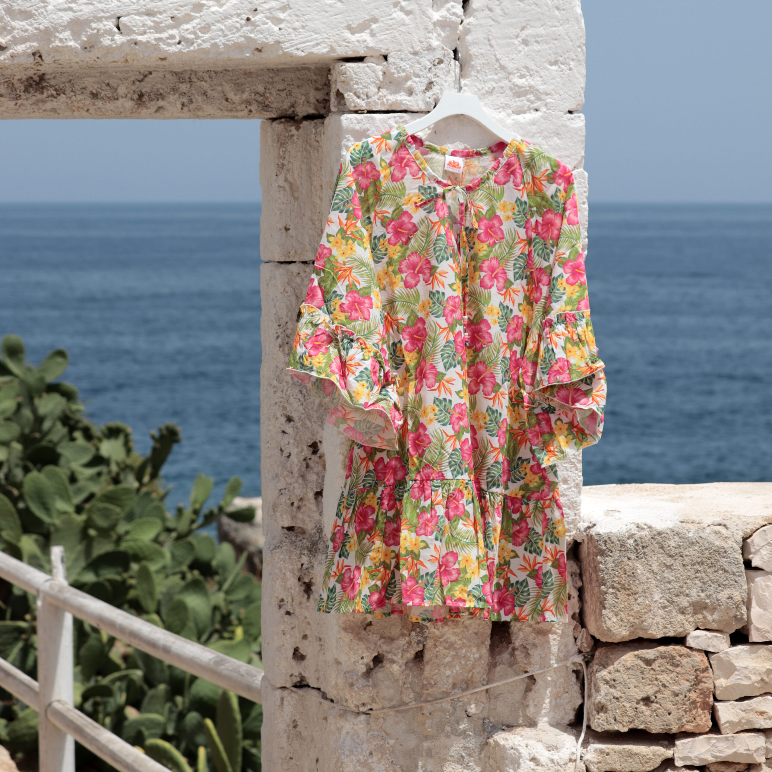 Per questo l’abbigliamento da spiaggia non può non prevedere un abito svolazzante e leggero, come la coloratissima versione di Sundek.