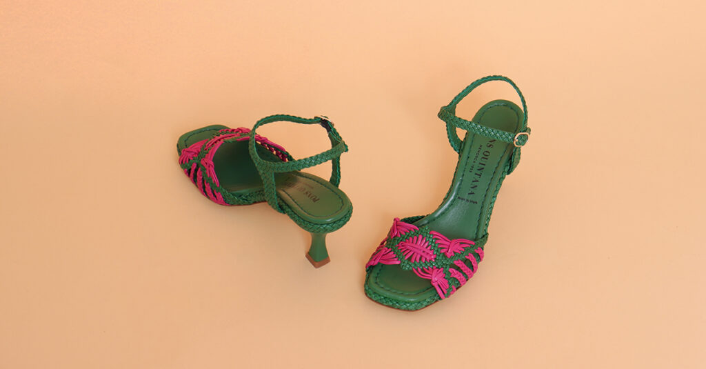 Il sandalo Pons Quintana Fiji in pelle intrecciata verde e fucsia ha un tacco midi quadrato, che esprime l’eleganza glamour del brand ad ogni passo. Queste scarpe per cerimonia sono ideali su pavimenti poco stabili come la pietra delle nostre meravigliose masserie o il prato.